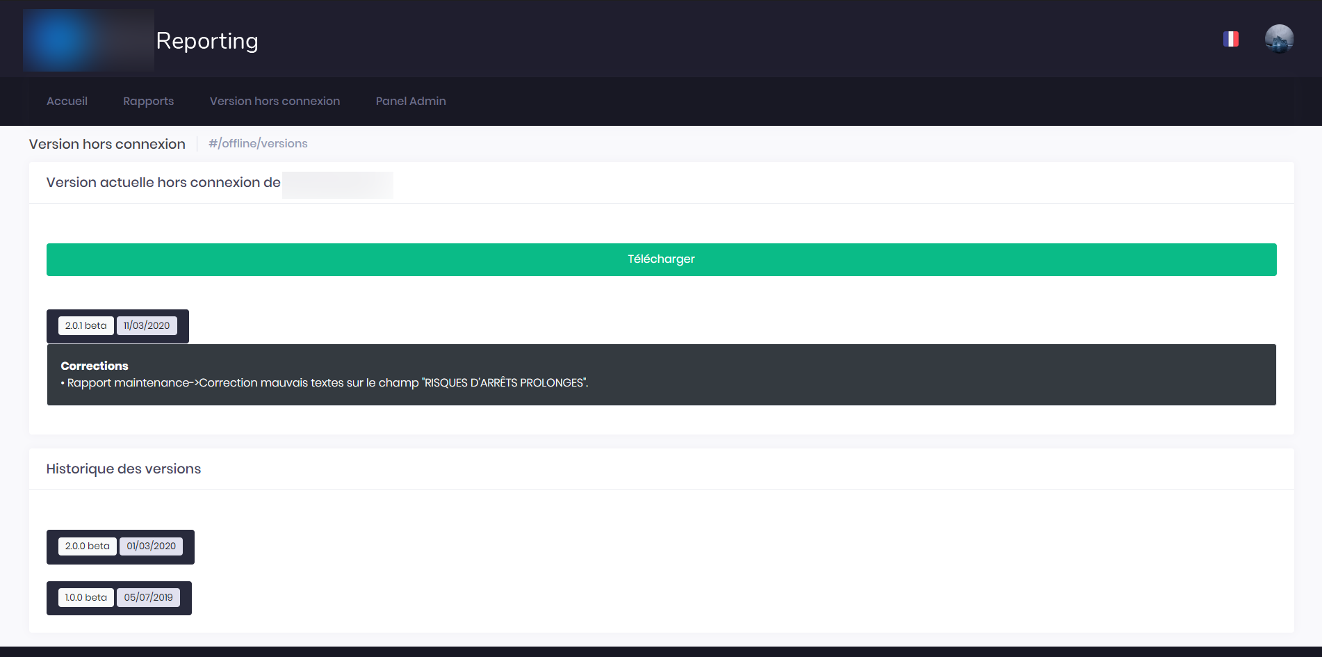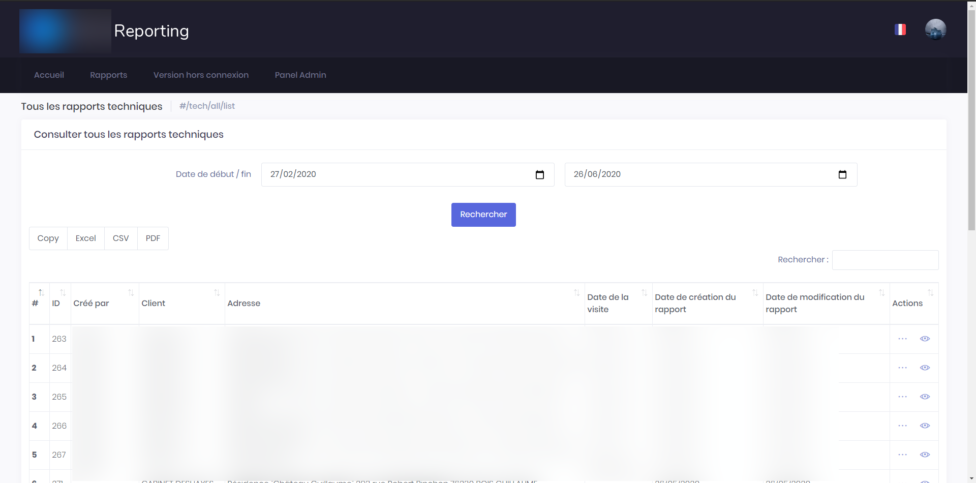 - Visualisation des rapports existants dans un tableau dynamique javascript (ex: recherche temps réelle, exportation en csv/xlsx, etc...),